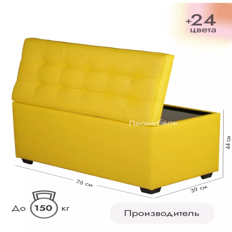 Пуфик 800-Я для прихожей (Ш 76; Г 39; В 44) имеет прочный каркас из белого ламинированного ДСП 16 мм и обивку из экокожи, можно протирать влажной тряпочкой и использовать в ванной комнате, сверху укрыт наполнителем из поролона 40 мм, по бокам 10 мм. Прочные петли дают надёжную фиксацию крышки в открытом положении. ПВХ ножки не царапают напольное покрытие, можно заменить на мебельные колеса. В накопительном коробе (330х708х338) под мягким сиденьем можно хранить: одежду, инструменты, постельное белье. Банкетка может служить подставкой под ноги, столиком в гостиной или кабинете у кресла, станет функциональным мягким стулом на кухне, ящик заменит обувницу в коридоре, гардеробной и вместит большое количество коробок с обувью, в детской комнате можно хранить игрушки, книги. Подойдет в дом на утепленный балкон и лоджию, украсит интерьер на даче и в квартире. Пуфик не требует сборки, максимальная нагрузка 150 кг. ПК-Леомебель более 20 лет на рынке, широкий ассортимент мебели.Сделано в России.