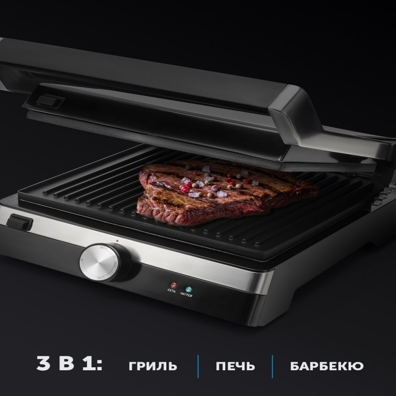 3 в 1: Гриль, Печь, Барбекю. Регулировка температуры - от 80 до 240 градусов. 2 съемные панели с антипригарным покрытием BIOTORE. Плавная регулировка температуры. Возможность использования в открытом положении. Рабочие поверхности раскрываются на 180 градусов. Кнопка высвобождения панелей для удобства использования. Рифленые панели способствуют равномерной прожарке. Рабочие поверхности имеют каналы для стекания жира в поддон. Лопатка для очистки панелей в комплекте. Регулировка высоты верхней панели. 2 индикатора работы. Поддон для жира.
