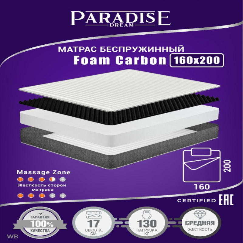 Хороший беспружинный матрас для кровати - залог крепкого сна и хорошего настроения. Ортопедический вариант с учётом анатомических особенностей тела человека позволяет отлично выспаться. Основной слой матраса - Healthy Support Foam, инновационная пена для здорового сна, благодаря которой достигается максимальный комфорт. У анатомического матрасаFoam Carbon верхний слой HEALTHY Coal Foam выполнен из пены с угольной пропиткой и массажным эффектом. Кроме того, он придаёт поверхности больше жёсткости и обладает антибактериальным действием. Такой беспружинный матрас идеален для активных людей, интересующихся спортом, так как позволяет полностью расслабиться и прекрасно отдохнуть.Матрас для кровати представлены на двуспальную кровать (180x200, 160x200, 140x200), матрас на полуторную кровать (120x200), матрас на односпальную кровать (90x200, 80x200). Можно выбрать вариант для любой кровати, в том числе детский матрас. Ортопедический матрас Foam Carbon - выбор тех, кто ценит комфортный отдых. Развернуть описание пенополиуретан 100%Описание