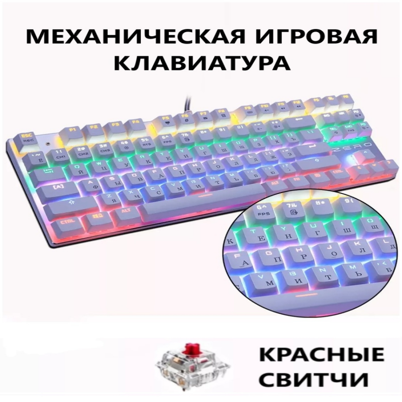 Клавиатура, клавиатура игровая, механическая клавиатура с подсветкой RGB ZERO X76 на красных, синих или черных свитчах. Выбор покупателей по всему миру! Клавиатура механическая, каждая кнопка сделана с использованием отдельного переключателя (свитча). Игровая клавиатура, качественная, с красивым дизайном и приятной упаковкой. Игровая клавиатура имеет провод в матерчатой оплетке и дает приятные ощущения при нажатии на клавиши. В механической игровой клавиатуре использованы свитчи зарекомендовавшего себя производителя JIXIAN. В наличии клавиатура белая и черная; с черными или белыми клавишами на красных, синих и черных свитчах. Клавиатура с красными свитчами позволяет пользователю легко и относительно тихо нажимать на клавиши, такие свитчи стоят в большинстве игровых клавиатур. Клавиатура игровая с синими свитчами отличается характерным щелчком при нажатии. На такой клавиатуре довольно легко и быстро печатать, клавиатура имеет ясную точку нажатия и высокую скорость возвращения в изначальную позицию. Механическая клавиатура с черными свитчами имеет почти неслышный звук при достижении точки нажатия и требует чуть больше усилия при нажатии. У такой клавиатуры отсутствует тактильная отдача, в основном такая игровая механическая клавиатура используется геймерами в шутерах или RTS. Развернуть описаниеОписание