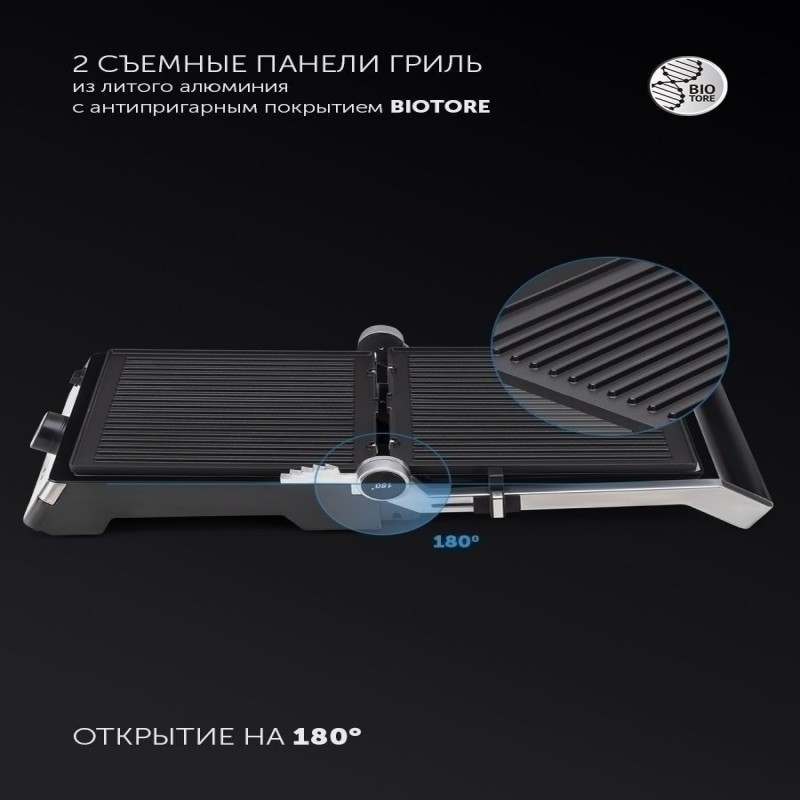 3 в 1: Гриль, Печь, Барбекю. Регулировка температуры - от 80 до 240 градусов. 2 съемные панели с антипригарным покрытием BIOTORE. Плавная регулировка температуры. Возможность использования в открытом положении. Рабочие поверхности раскрываются на 180 градусов. Кнопка высвобождения панелей для удобства использования. Рифленые панели способствуют равномерной прожарке. Рабочие поверхности имеют каналы для стекания жира в поддон. Лопатка для очистки панелей в комплекте. Регулировка высоты верхней панели. 2 индикатора работы. Поддон для жира.