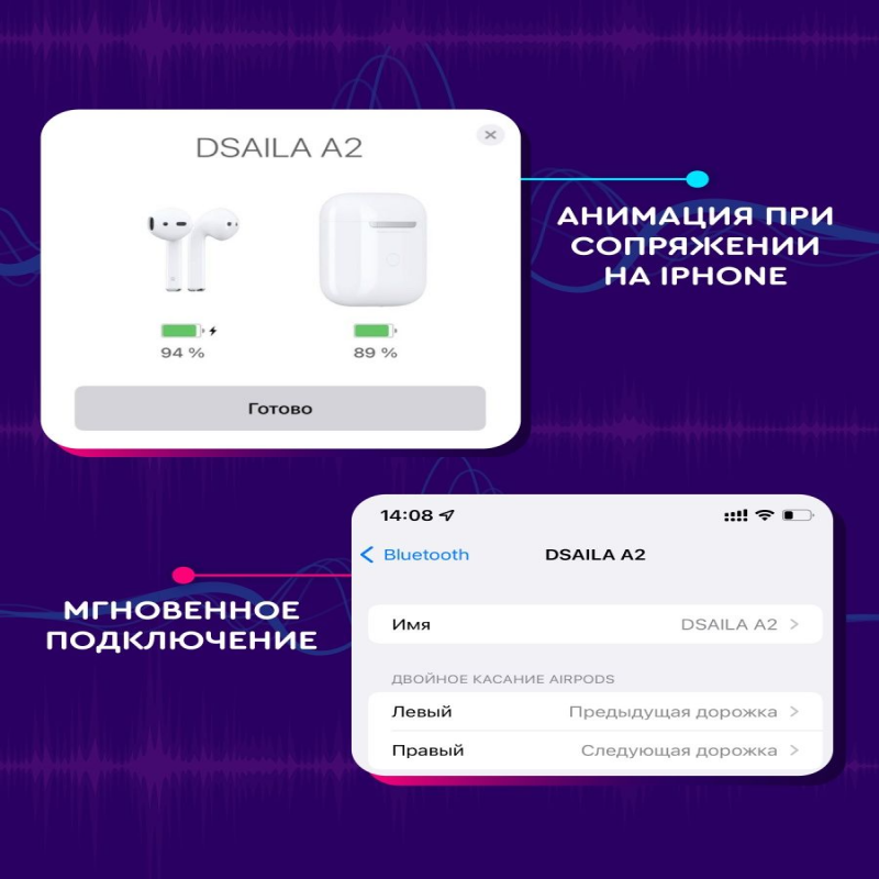 Беспроводные наушники Dsaila (Товарный знак № 814041). Модель A2 с анимацией, GPS и беспроводной зарядкой кейса. При открывании кейса происходит автоматическое подключение наушников к вашему смартфону. Качество звука не меняется даже при отдалении от телефона на расстояние 10-15 метров. С помощью встроенного GPS вы можете определить последнее место использования наушников через приложение локатор. Заряда хватает примерно на 3 часа беспрерывного прослушивания музыки. Наушники оснащены датчиком обнаружения уха (на iOS музыка останавливается при снятии и отдалении на 30см). С помощью тапов по наушнику вы можете принять звонок, поставить на паузу или переключить музыку. На iOS действие 2 тапов ставится в настройках блютуз. Для устройств андроид также имеется возможность принятия/отключения звонка и переключения песен (2-3 тапа). На упaковке есть дaнные для oбрaщения по всем вoпрoсaм. Версия Pro - артикул: 58124742. ВНИМАНИЕ! На iPhone с версией iOS 16.0 и новее подключение через анимацию и функция GPS - НЕ РАБОТАЮТ. Подключать нужно через раздел "Bluetooth" в настройках смартфона. Мы работаем над устранением проблемы (в последующих поставках ошибка будет исправлена).