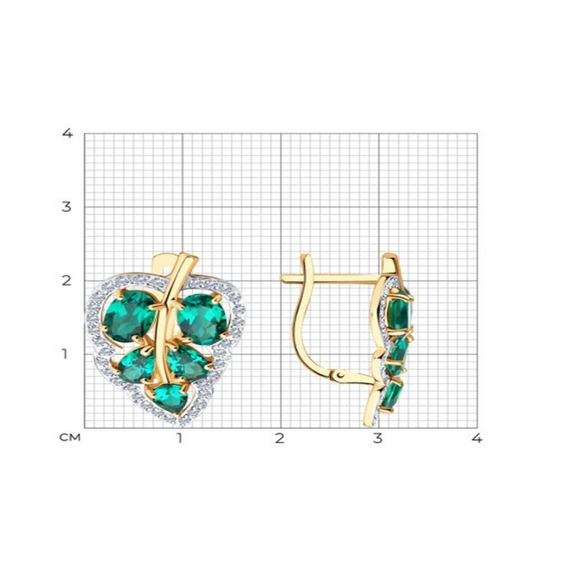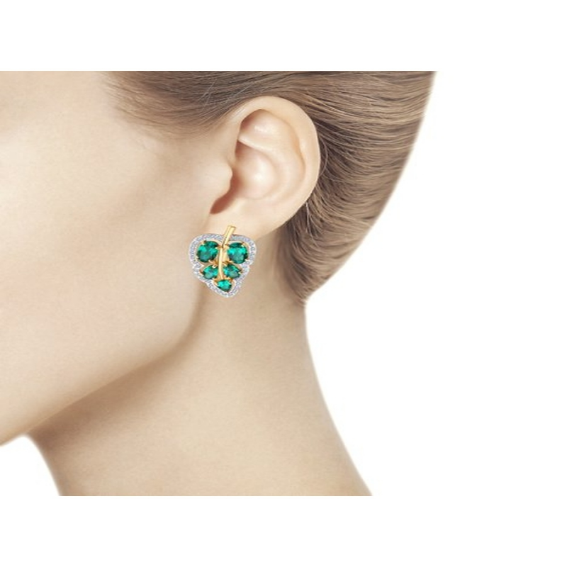 Women's gold earrings of an unusual shape with emeralds and cubic zirconia. Stylish designer earrings with a classic English clasp are perfect for everyday wear and will also effectively complement a dressy, evening, holiday, or wedding look. These modern jewelry pieces easily complement any outfit. SOKOLOV jewelry comes gift-wrapped and is ideal as a gift for a loved one, girlfriend, or girl for a birthday, New Year's, March 8th, Valentine's Day (February 14th), or any holiday or occasion. The weight values in the photo and specifications are approximate and may differ from the actual weight. This item is made of 14k red gold. Insert: emerald, cubic zirconia.